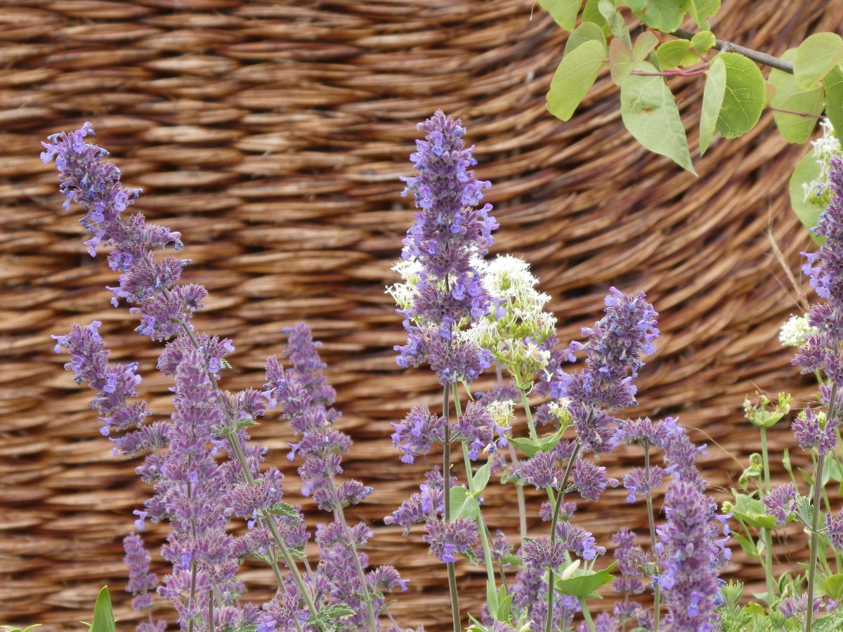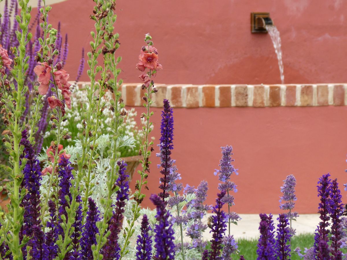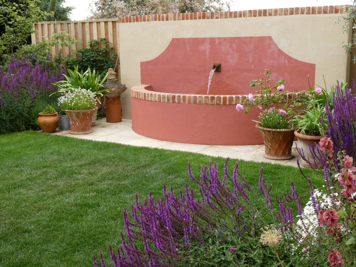 We created two spaces, disguising the drive as a gravel garden. An axial path, laid with brick pavers links the two. The upper garden consists of a dining terrace, lawn, and borders. The shelter of an old wall is enhanced by a woven willow screen. A small ornamental tree (Pyrus salicifolia ‘Pendula’) is framed by the screen’s descending curve. Pavers edge the lawn. The existing ornamental water tank has been restored. An ochre limewash evokes the romantic period gardens of Sintra, Portugal. Planting is a layered mix of resilient cottage garden favourites and coastal planting.