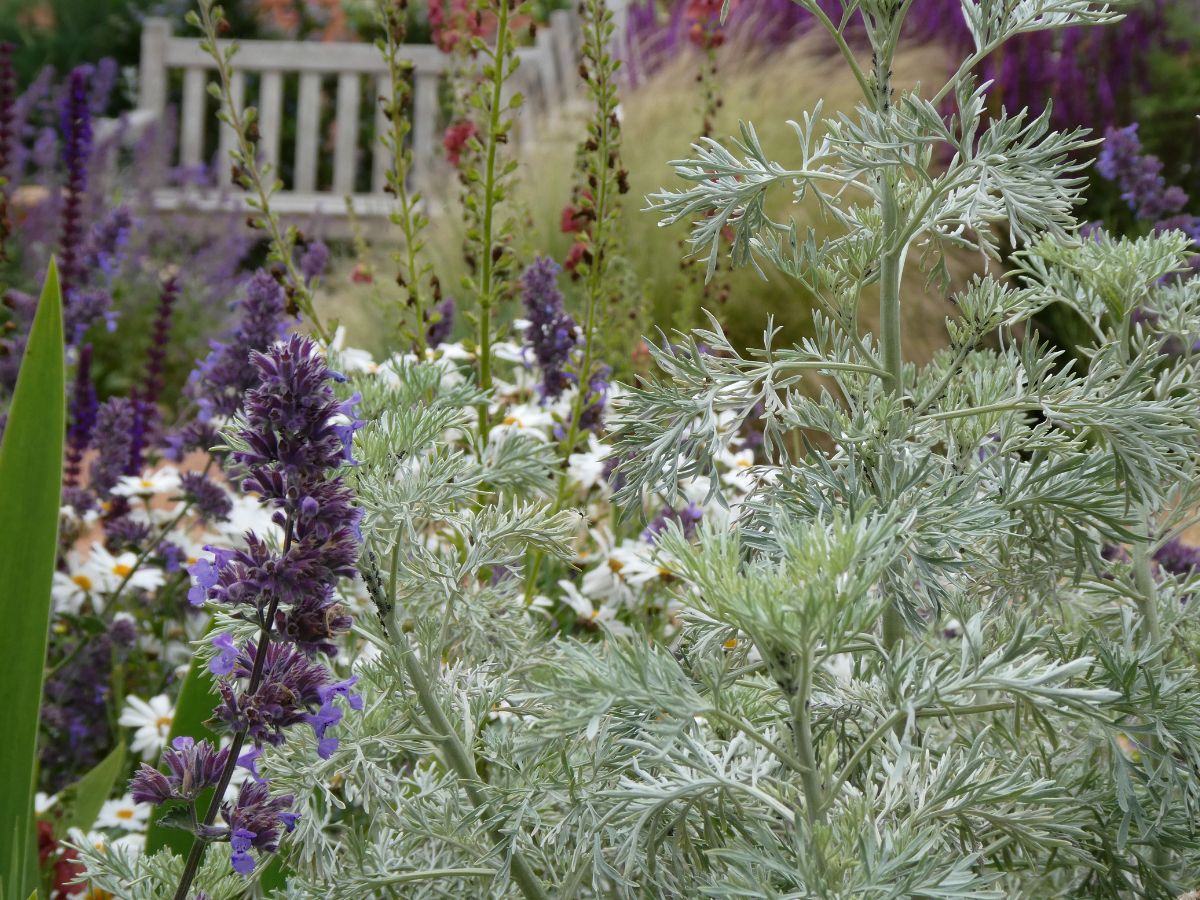 The lower garden consists of a long, narrow brick paver and gravel terrace with views over Aldeburgh’s rooftops to the sea. Planting is a mix of coastal shrubs, perennials and grasses. Self-seeding is encouraged. An amphora punctuates the axial path.