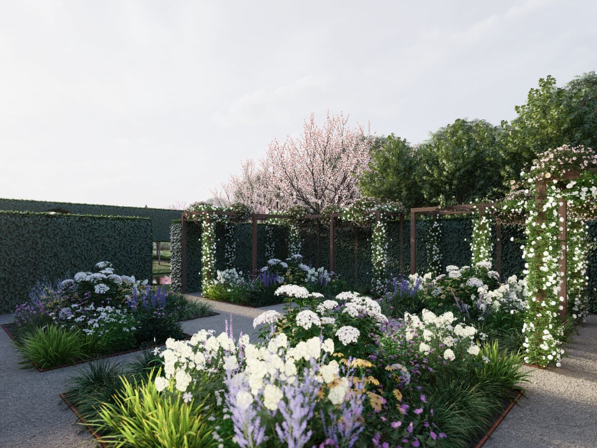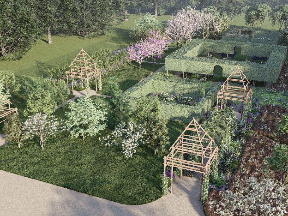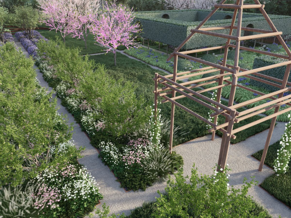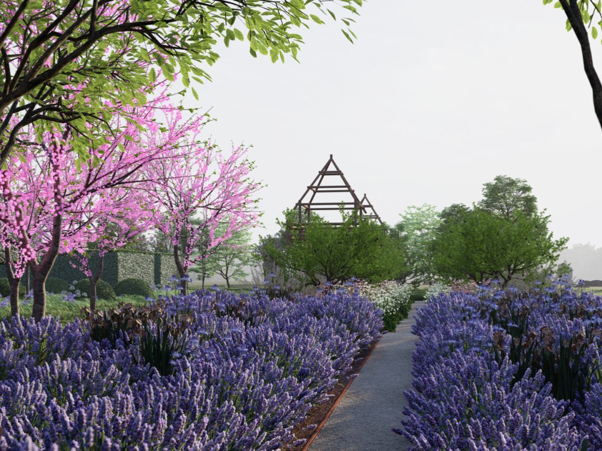 Features include: The Cloisters (enclosed by a dramatic double row of pleached hornbeam). Garden of Simples (the main ‘flower garden’, enclosed by an evergreen hedge). Hortus Conclusus (surrounded by an evergreen hedge and a simple timber). Fish Ponds (two large, shallow ponds and surrounding mown grass and ornamental trees). Green Amphitheatre (embankment sculpted into the existing hillside). Orchard (a double row of fruit trees underplanted with spring bulbs). Lavender Garden. Twelve Apostles (a walk with a double avenue of topiary domes set in ornamental grasses). Wilderness. (walks in the existing woodland). Meadows and Water Meadow (blending the formal gardens into the surroundings, accessed via serpentine walks). Arched Pergola. ‘Gate Houses’ and pavilions (simple structures in timber or box section steel echoing the arches of the Abbey ruins).