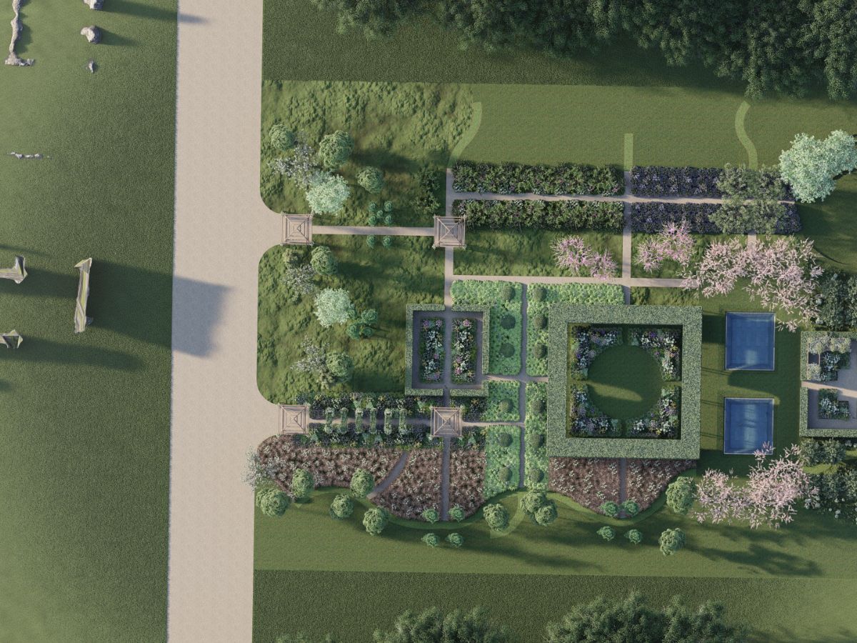 A traditional formal layout is blended into the landscape by plantations of ornamental grasses and native trees. It is bisected by axial pathways which can be mown grass or laid to gravel. Pedestrian circuits loosen up and become more free-form as the gardens blend into its surroundings.