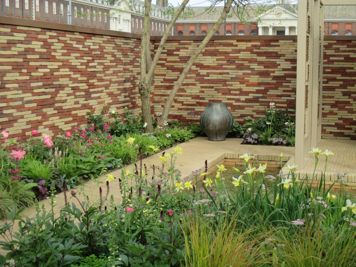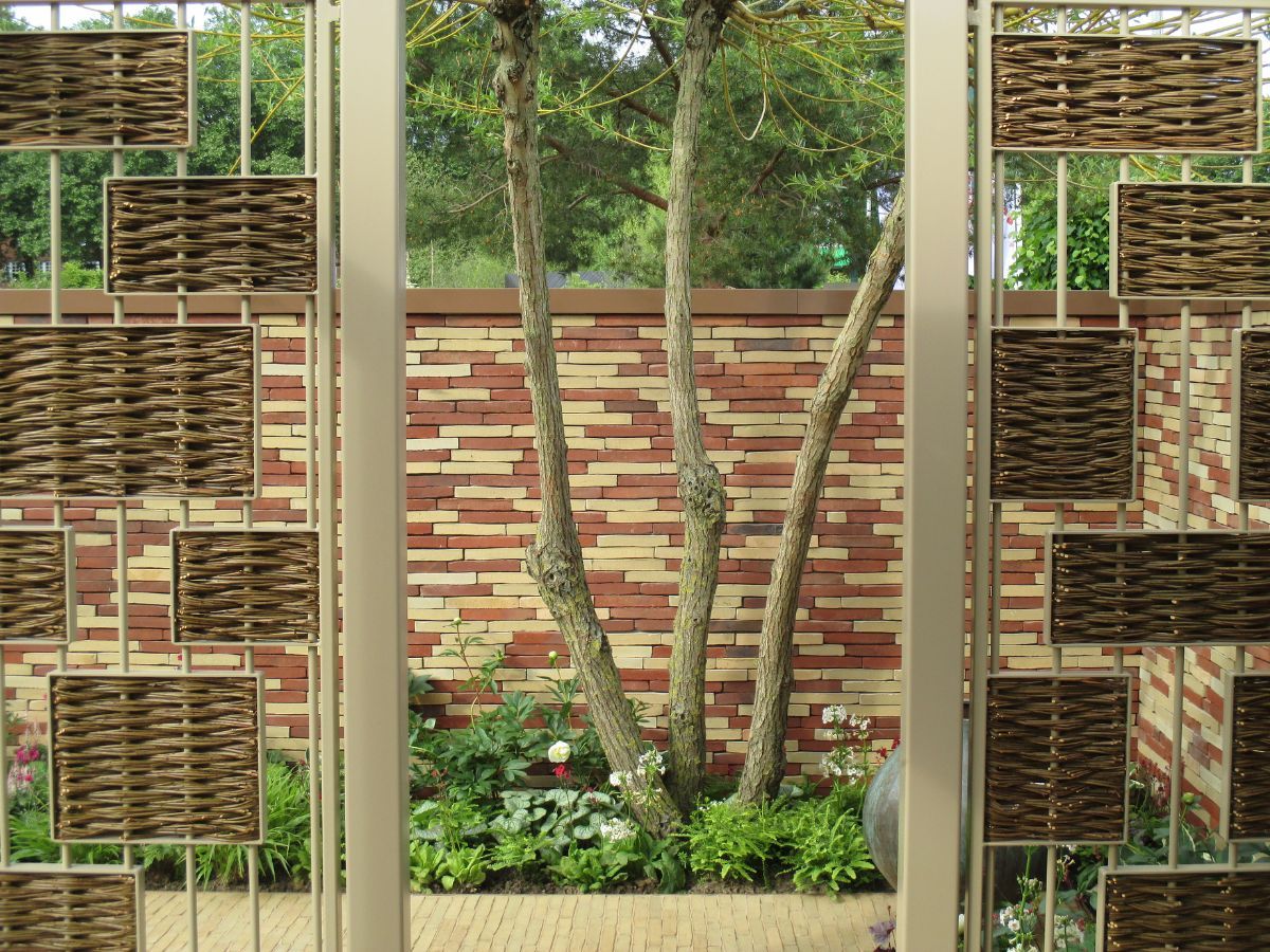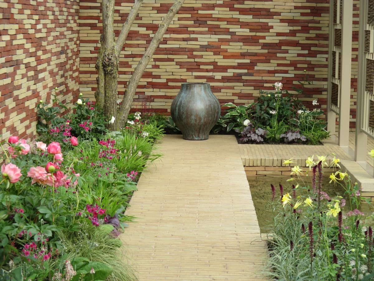 The garden was sponsored by Nina Campbell and William Yeoward. Clay pavers and brick slips were generously donated by Brickworks Vande Moortel.