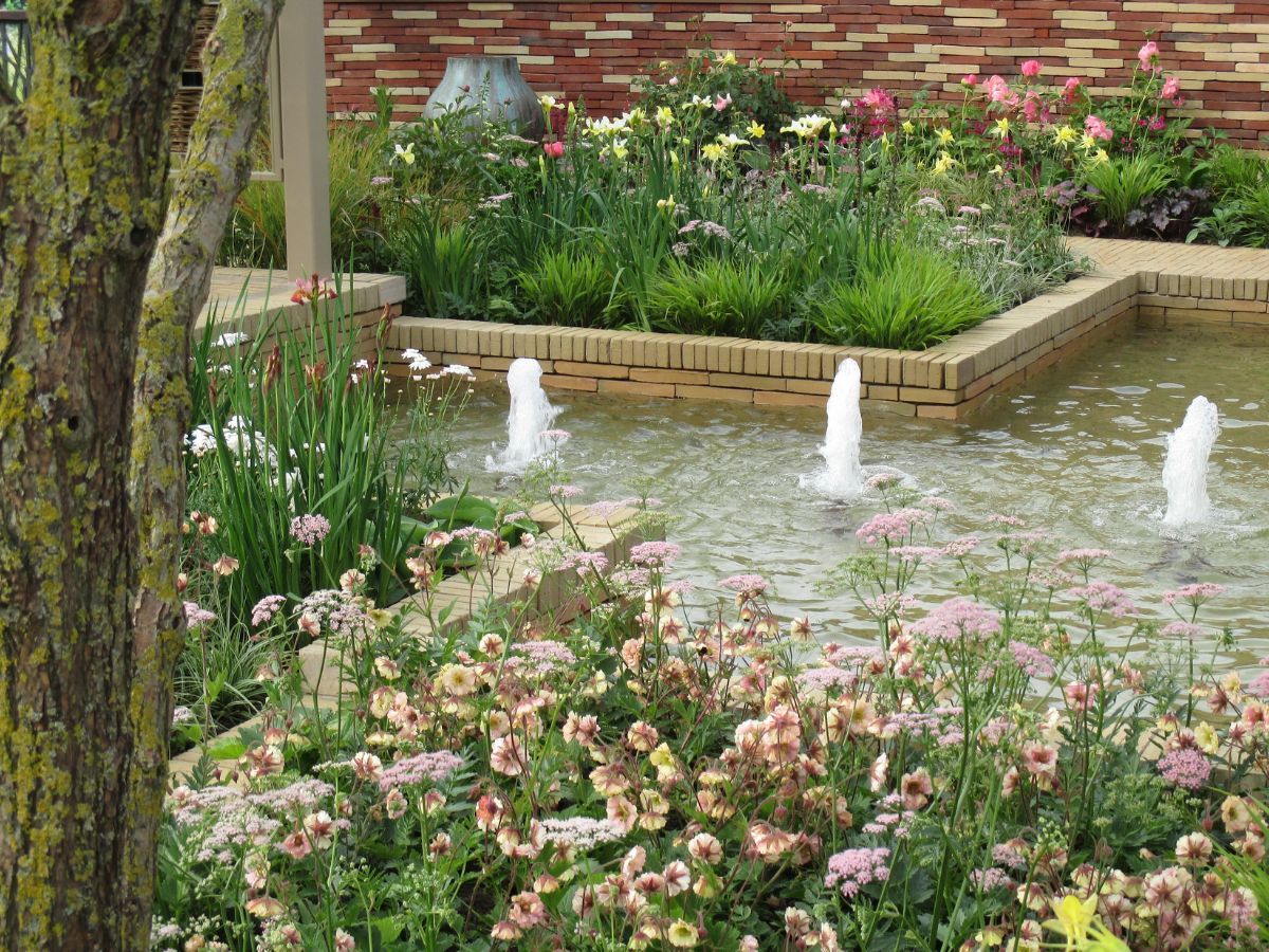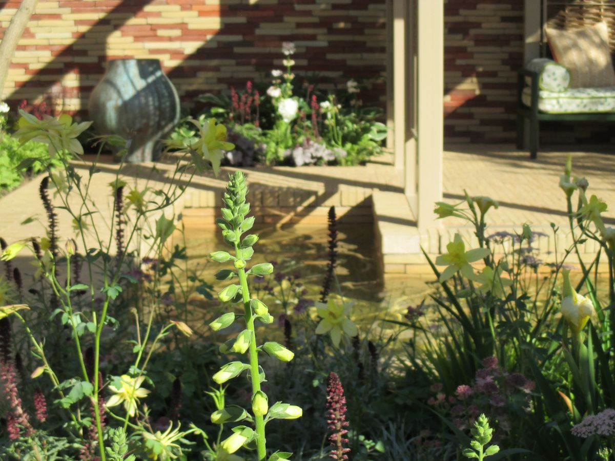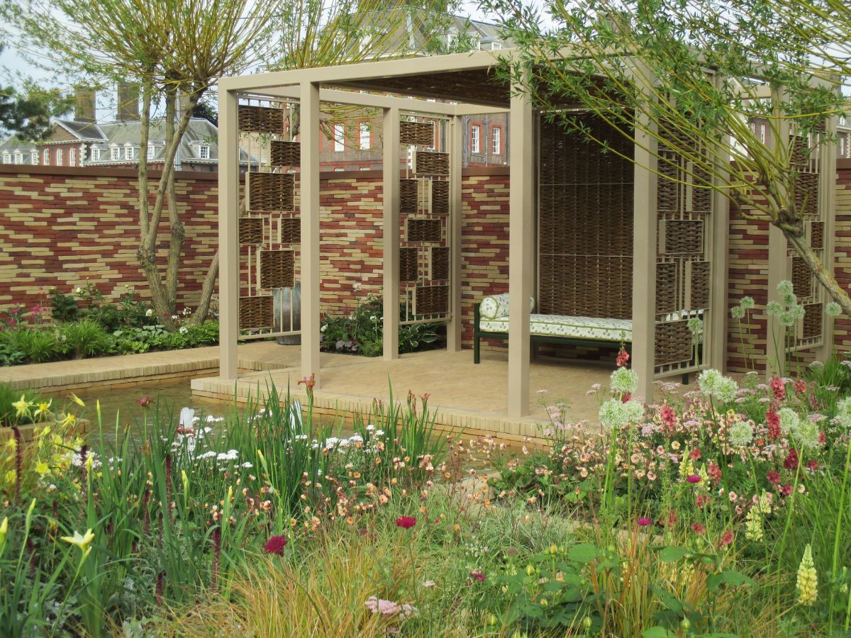 The garden was sponsored by Nina Campbell and William Yeoward. Clay pavers and brick slips were generously donated by Brickworks Vande Moortel.