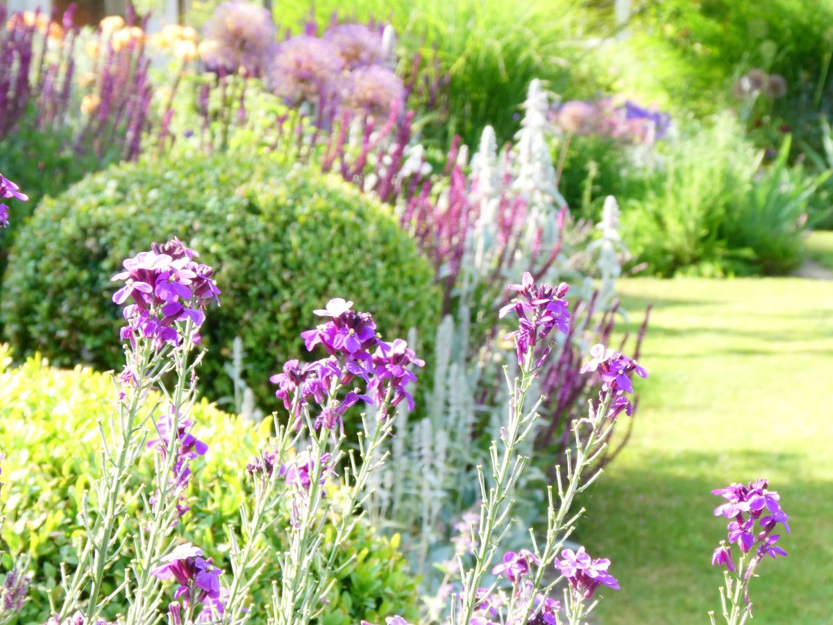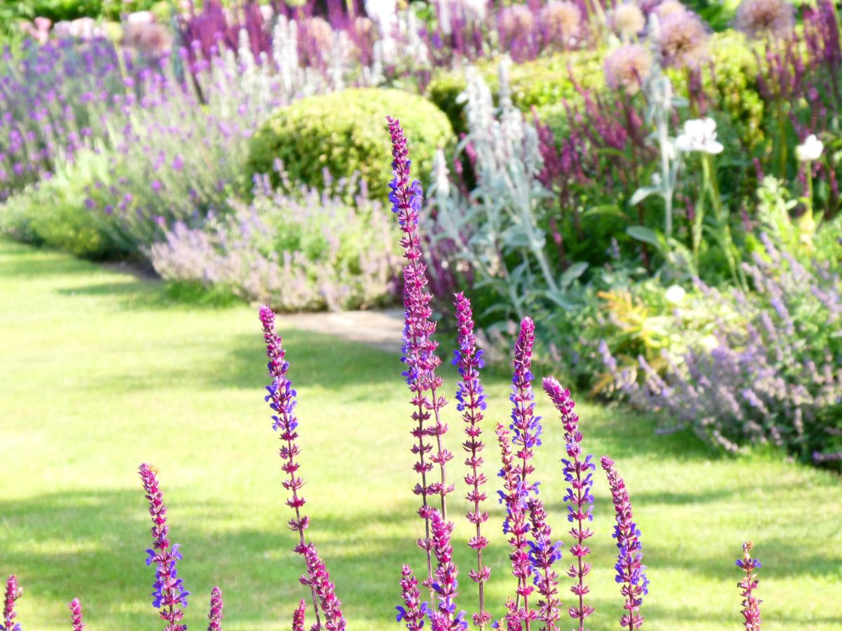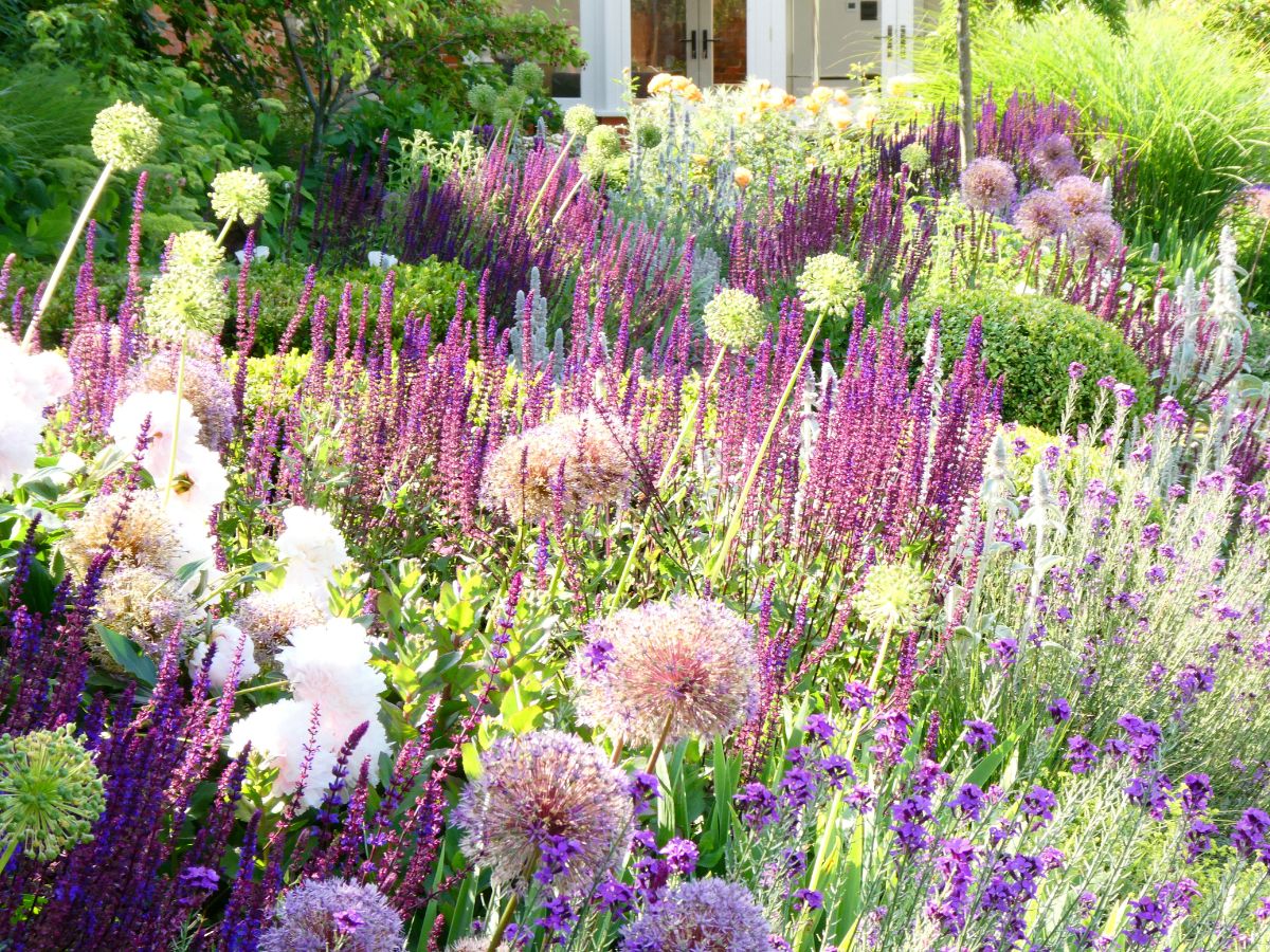 The garden lacked verticality. We introduced small, flowering ornamental trees in each corner of the rectangular beds, creating perspective and framing the vista into the landscape beyond. The leading roles in our planting palette of blues, purples and pinks were given, in sequence, to: Irises, Peonies, Roses, Hydrangeas and Dahlias. Long-standing favourites such as Lavender, Salvia, Sedum, Phlox and Veronicastrum provided seasonal support.