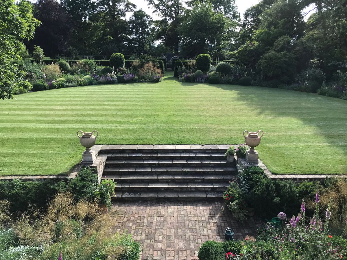 The turf bank and pinched set of steps were replaced by a painted blockwork wall, faced with evergreen hedging. The latter has now matured to conceal the wall. An imposing set of reclaimed York Stone steps frame the house from the garden and are proportionally in keeping with the lawn and handsome borders beyond. Two urns -sourced by our clients- complete the mise en scene.